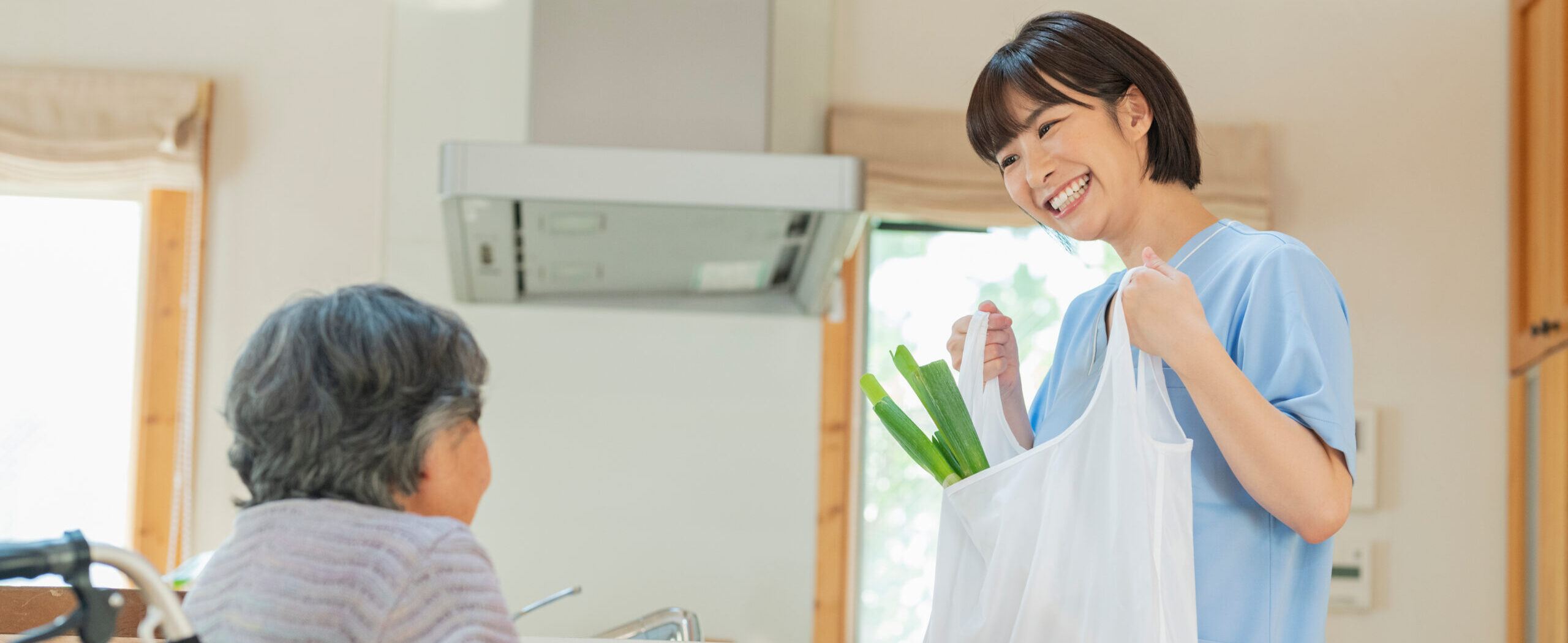 訪問介護では、お一人おひとりの体調や生活リズムに合わせて、日常生活を安心して過ごしていただけるようサポートしています。入浴や食事などをお手伝いする「身体介護」、掃除や洗濯などの家事を行う「生活援助」に加え、必要な時間帯に合わせて24時間365日、細やかなサービスを利用いただけます。