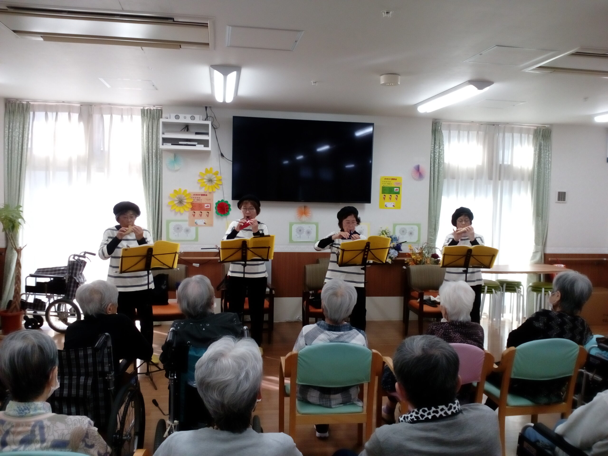 本日のレクリエーションはボランティアのオカリナワン・ツー・スリーによるオカリナ演奏です。いつもと違うレクリエーションにわくわく、ドキドキ(#^.^#)