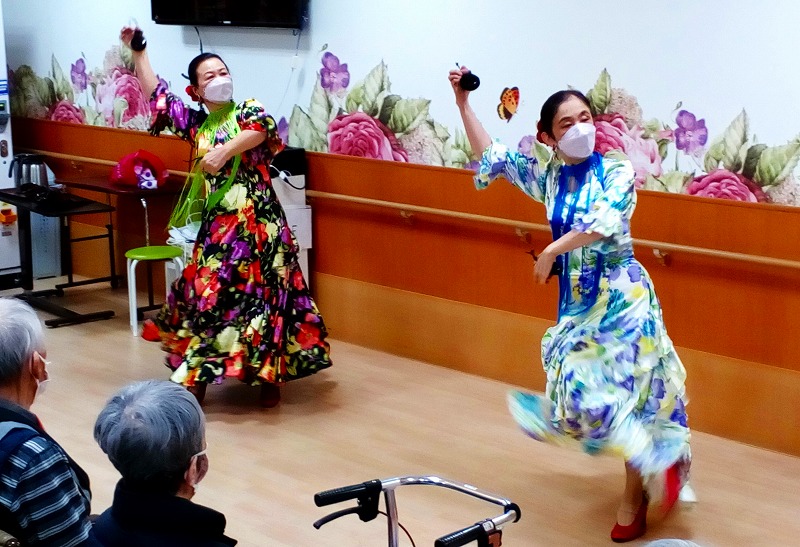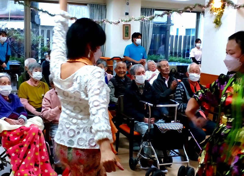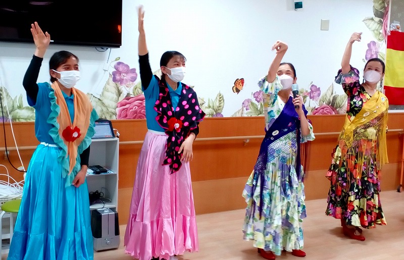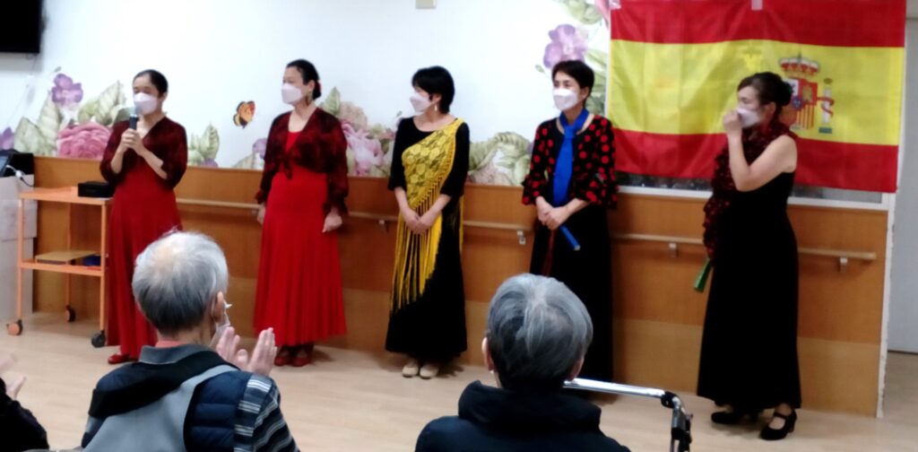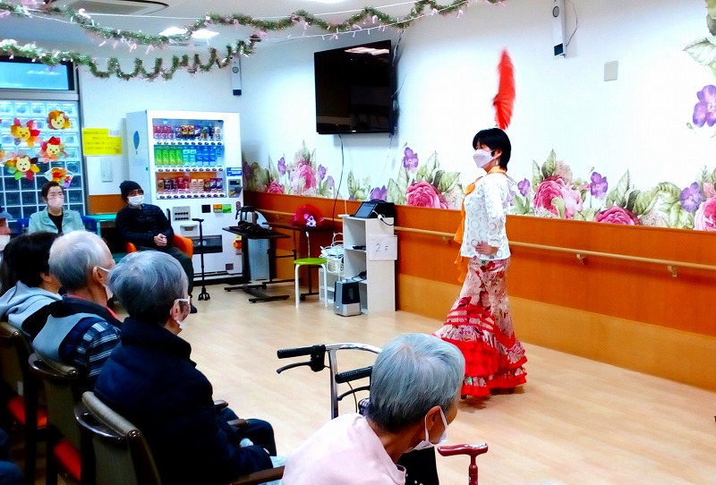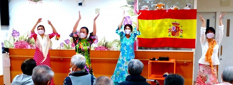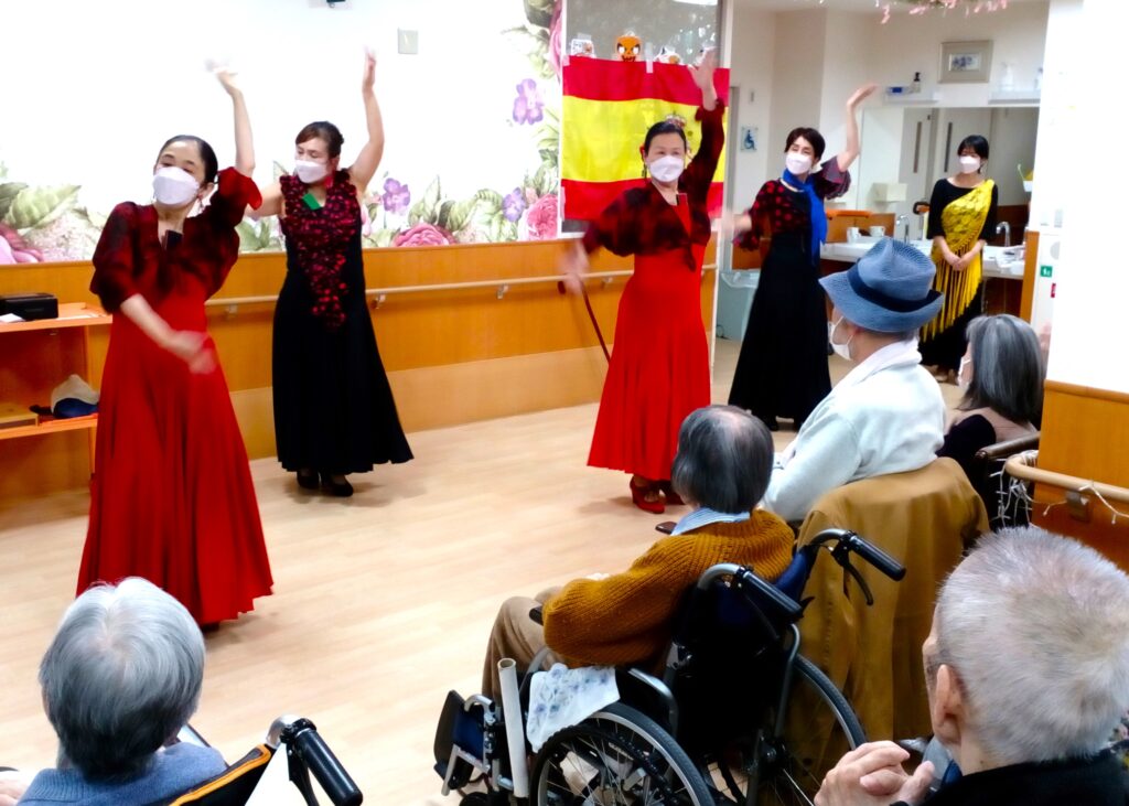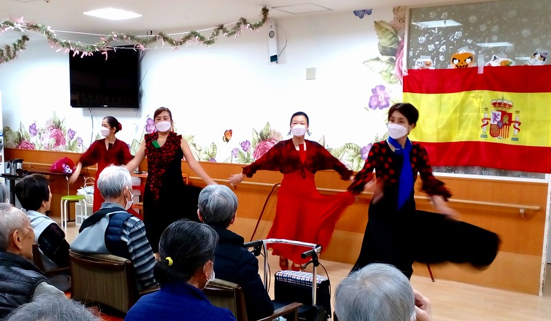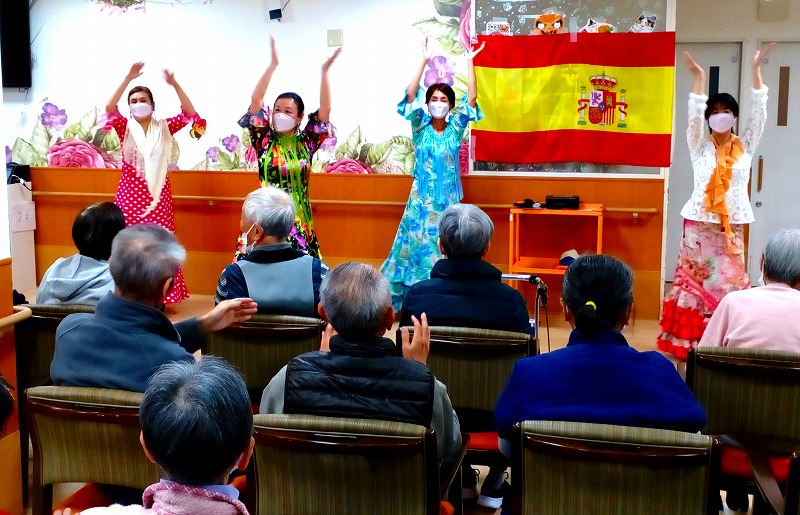 東住吉 フラメンコ鑑賞🌹 2025.11.28 今週のレクは、 ボランティア・黒バラシスターズ様を お迎えして、フラメンコ鑑賞。 大勢の入居者様がご観覧され、 躍動感あふれるパフォーマンスに 皆様魅了され拍手喝采でした👏 スタッフも衣装をお借りして踊りました😊