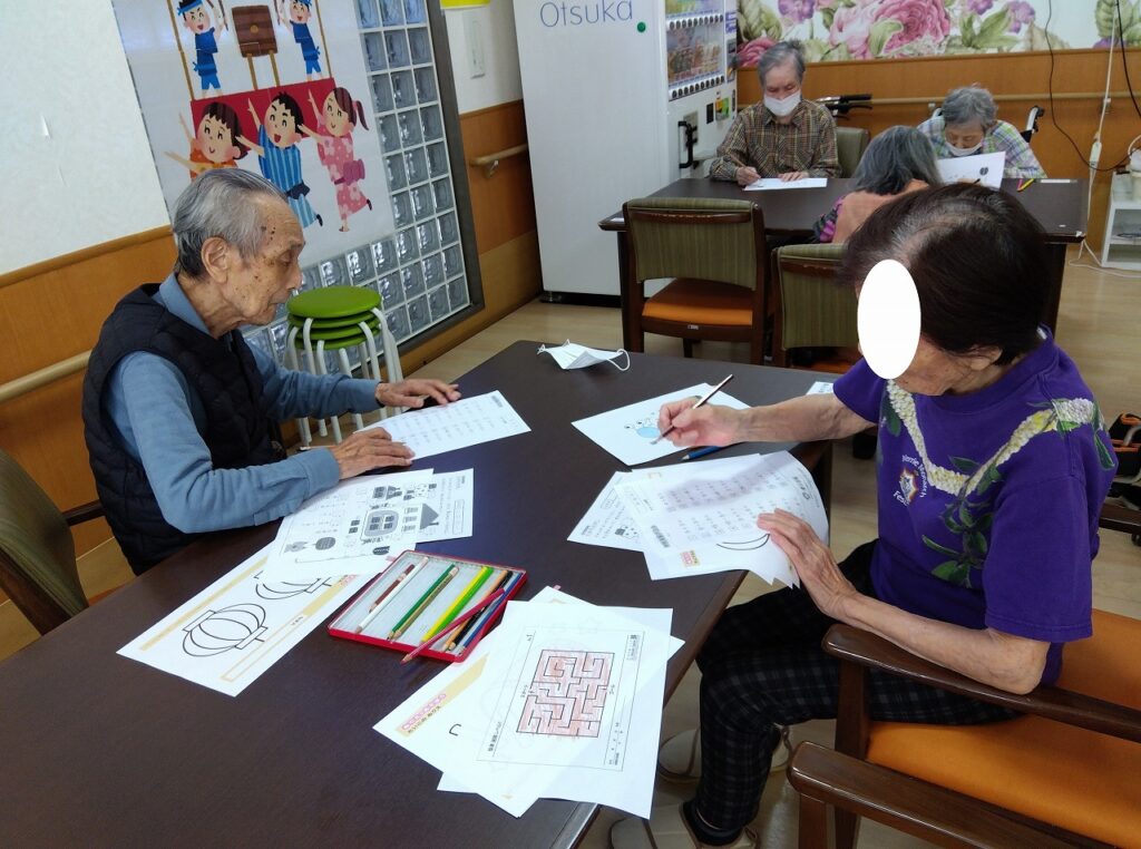 東住吉 レクレーション・脳トレ🙄 2025.11.28 本日のレクレーションは脳トレーニング!略して脳トレ! 準備運動から始まります(^^)/ ぬりえにめいろ点結び、計算プリントに漢字クイズ・・・ たくさん頭を使って皆様したい脳トレを されておりました(*^-^*)