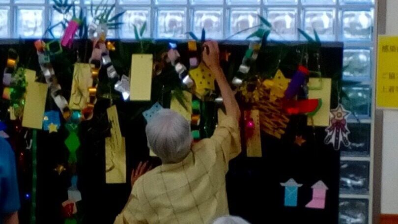 みなさまで準備した七夕飾りを笹にすべて吊るしてキラキラの笹飾りが完成し、七夕を背景にカラオケを楽しみました。