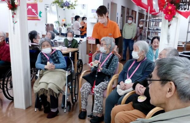 みちのく一人旅♪や、世界の国からこんにちは♪の歌に合わせて動画を観ながら体を動かします。歌いながら、体も動かして、大きく深呼吸して~。一曲終わると『楽しい~』『スッキリしたー』と皆さま楽しんでくださいました。