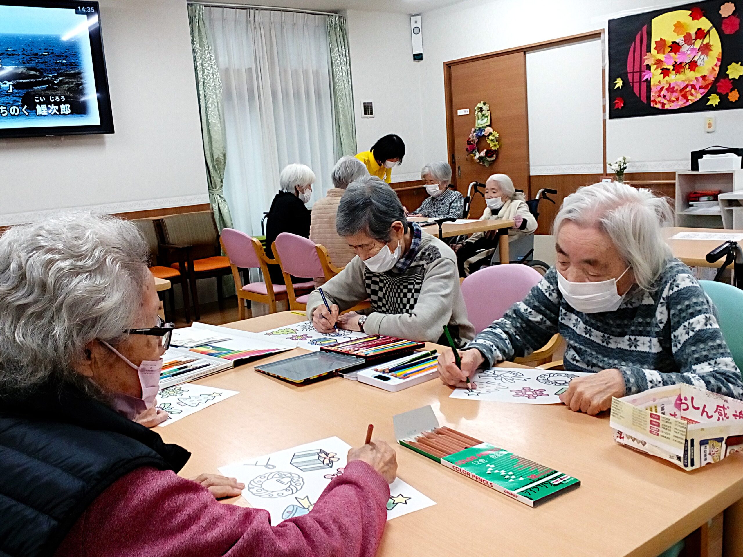 食堂を彩る塗り絵をみんなで楽しみました😊🎶