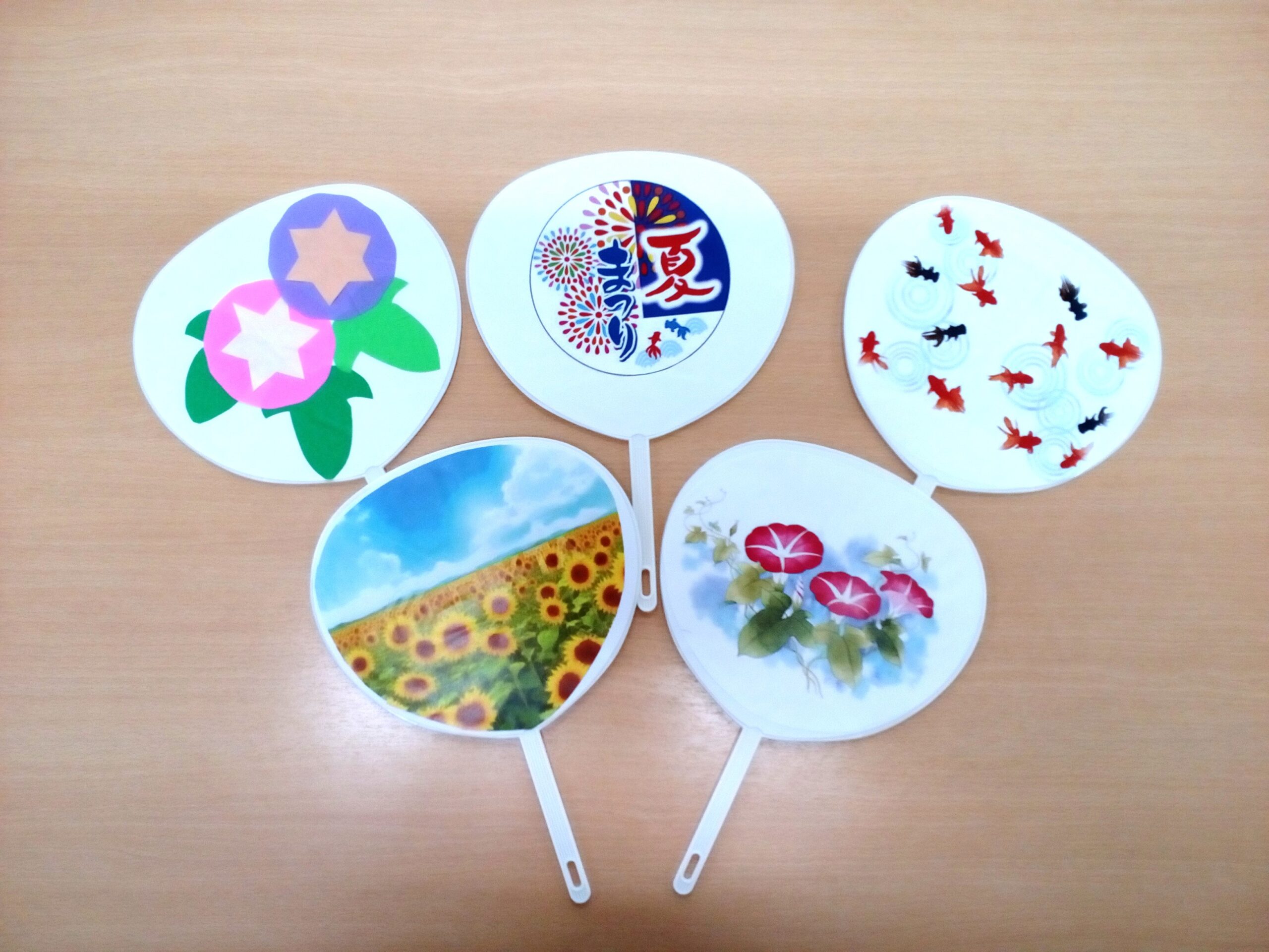 ご自身で好きな模様を選んでいただき、のりで貼っていきました。みなさん協力して楽しみながら制作されていました。早く出来た方は、今日参加出来なかった方のうちわも2個3個と作ってくださいました。