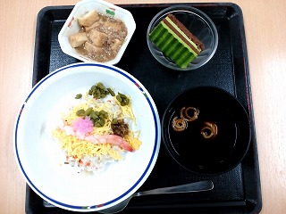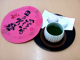 そして、お祝いの昼食膳と”紅白饅頭”をお配りしました。皆さまニコニコされて「美味しいよ~!」というお声もたくさんありました。