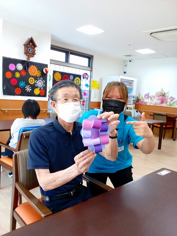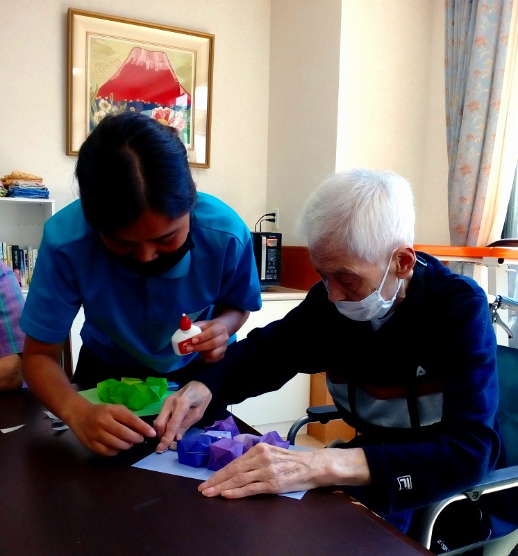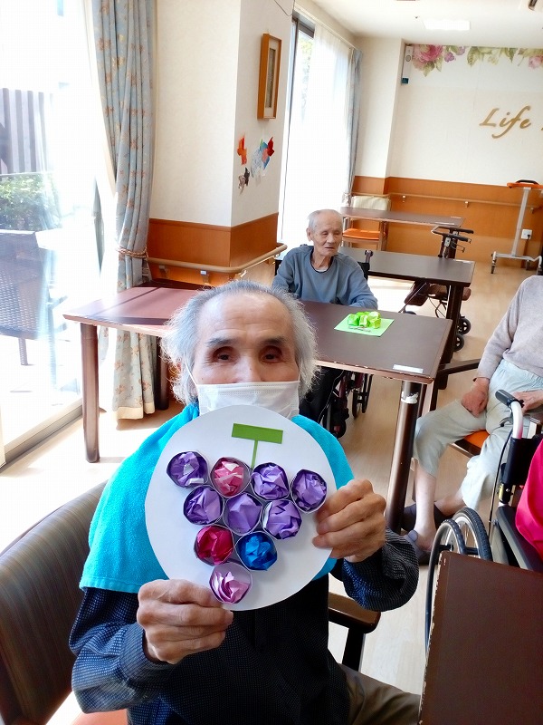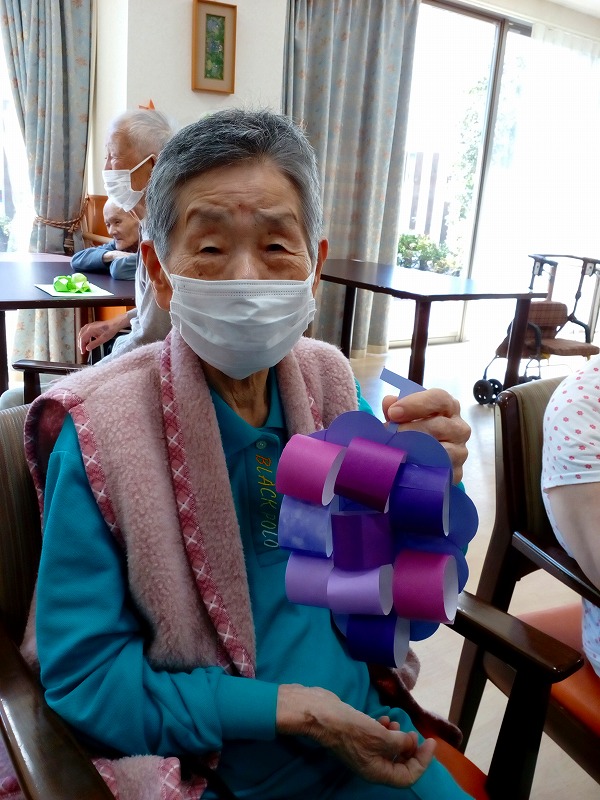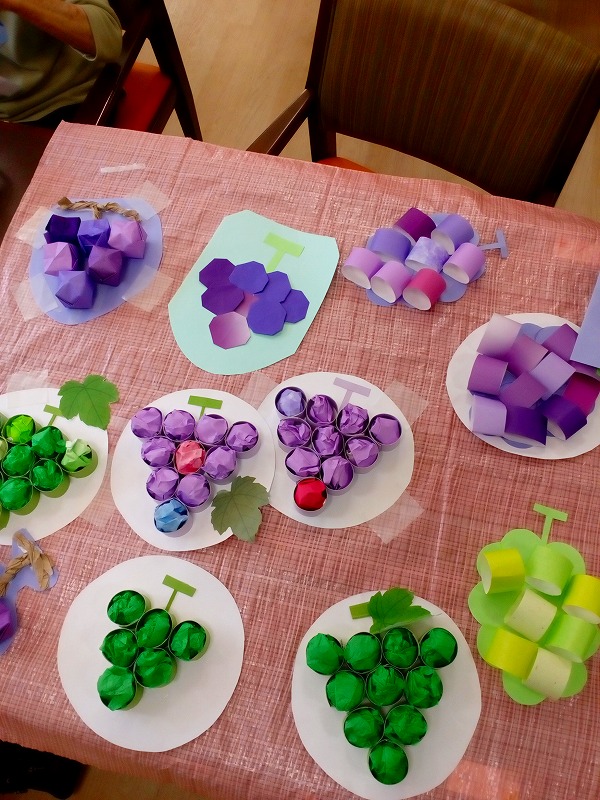 東住吉 秋のフルーツ工作 2025.11.28 今週は秋のフルーツ工作として、みなさまでユニークなぶどうをたくさん作りました🍇🍇🍇みなさま1粒1粒集中して作っておられ、ぶどうの紫と黄緑のグラデーションがとてもきれいです✨外はまだまだ暑いですが、食堂は秋らしい豊かな雰囲気に包まれてます💛