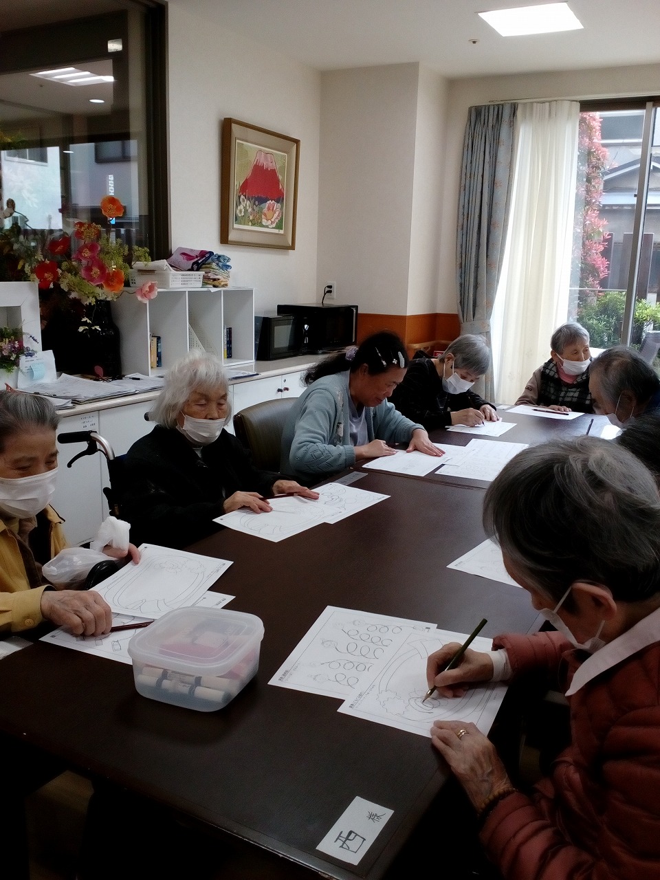 東住吉 鉛筆でなぞり絵・ティータイム 2025.11.28 本日はお花見が延期となり、鉛筆を使った”なぞり絵”を実施しました☆イラストの中の破線をなぞったり、好きな食べ物のイラストを描いたり、発想力の豊かさが溢れていました👏 来週のお花見を楽しみにしながらさくらの飾り付け🌸🌸 創作後のティータイム☕