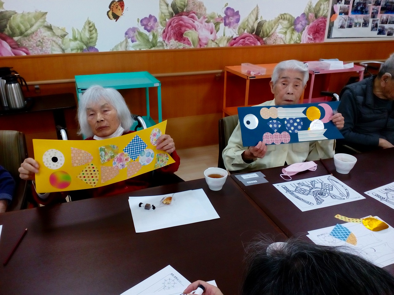 東住吉 鯉のぼりあ~と② 2025.11.28 先週に引き続き、鯉のぼりの制作をしました🎏 なぞり絵をみなさま真剣にペンで描かれ、立体的なかぶとと鯉のぼりが完成しました👏 全部で5体の鯉のぼりをみなさま協力し合って完成しました✨✨