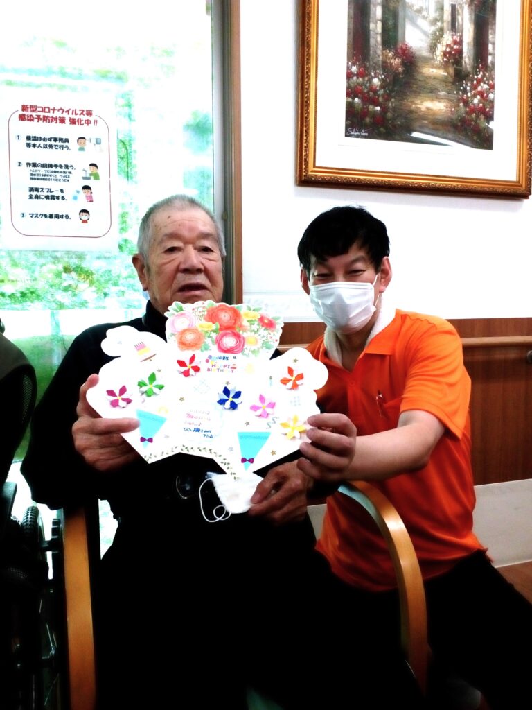 毎月第一週目の日曜日は昼食前にお誕生日会をしています。8月にお誕生日を迎えられる入居者様は3名です。皆さんでハッピーバースデーの歌を歌ってお祝いしました。スタッフからのバースデーカードもお渡ししました。