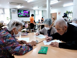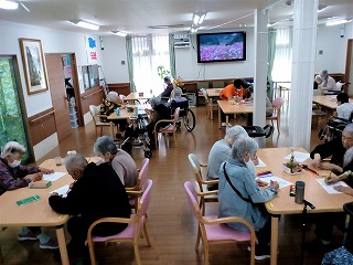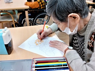 「あじさいは何色?」「上手に塗ってるね」と入居者様同士で会話しながらぬり絵を楽しまれていました。