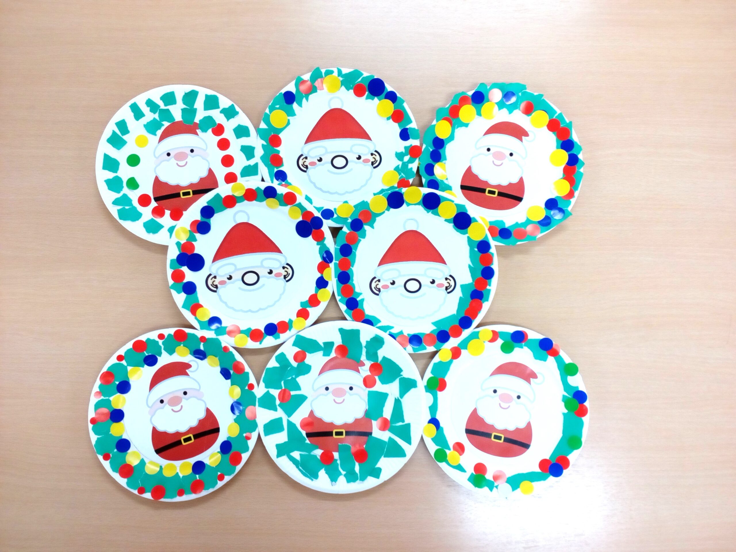 紙皿をリースに見立てて折り紙とシールでデコレーションしました。