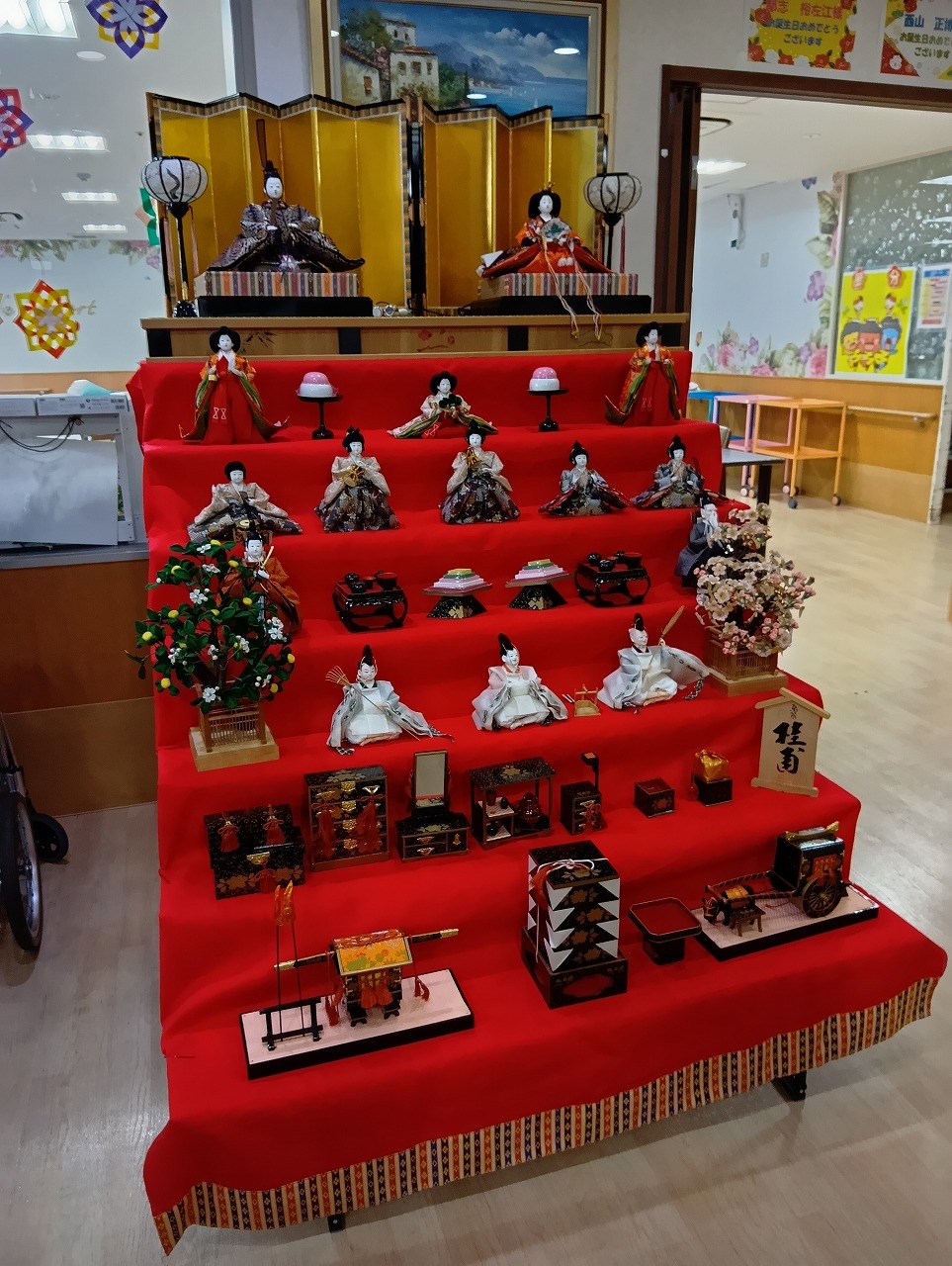 華やかな七段飾りを前に、「きれいね」「懐かしいわね」と、会話が出ております(*^^*)
