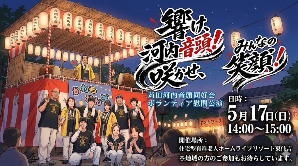 この度、当施設にて「苅田河内音頭同好会」様をお招きし、ボランティア慰問公演を開催することとなりました!👏🎊
