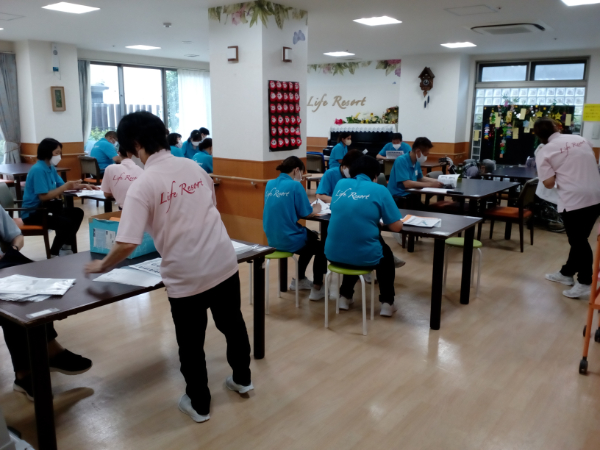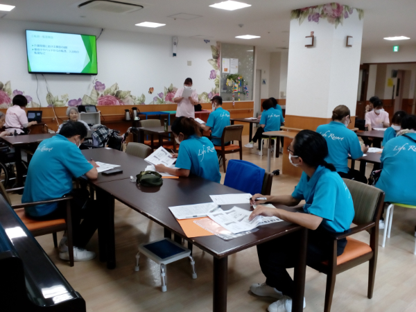 事故発生時には冷静な判断と適切な対応が求められる為、実際に事故が起こった場合、周囲の安全確保や入居者様の意識・呼吸状態等の確認ができ、救急車を呼ぶまでの一連の流れをスタッフ同士で確認を行っています。